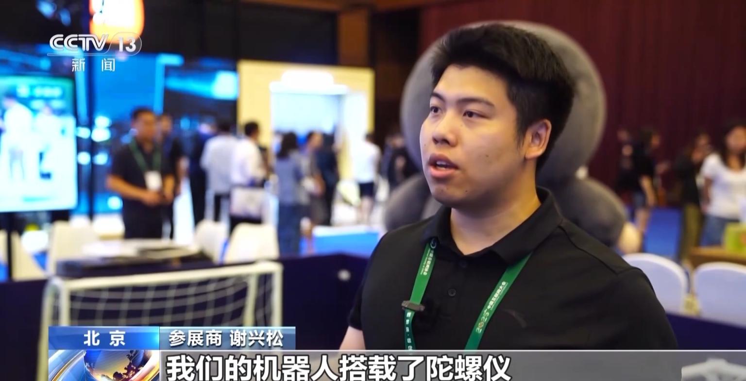 参展商 谢兴松:我们的机器人搭载了陀螺仪,能在运动过程中自平衡。在足球赛的激烈对抗中,可以最大限度测试人形机器人的性能极限,能在未来更好应用。