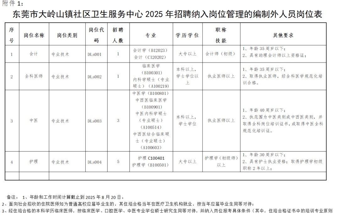 5️⃣东莞市大岭山镇社区卫生服务中心2025年招聘纳入岗位管理的编外人员10人